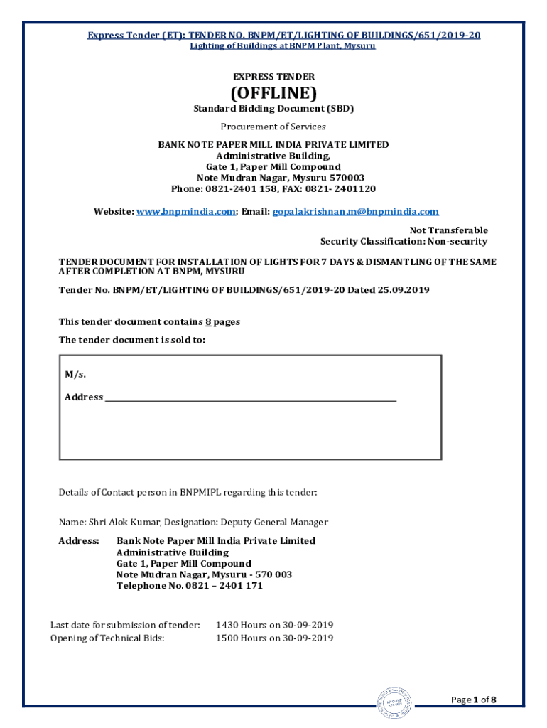 Express Tender (ET): TENDER NO. BNP/ET/LIGHTING OF BUILDINGS/651/201920 Lighting of Buildings at BNP Plant, MysuruEXPRESS TENDER(OFFLINE)Standard Bidding Document (SBD) Procurement of Services banknote