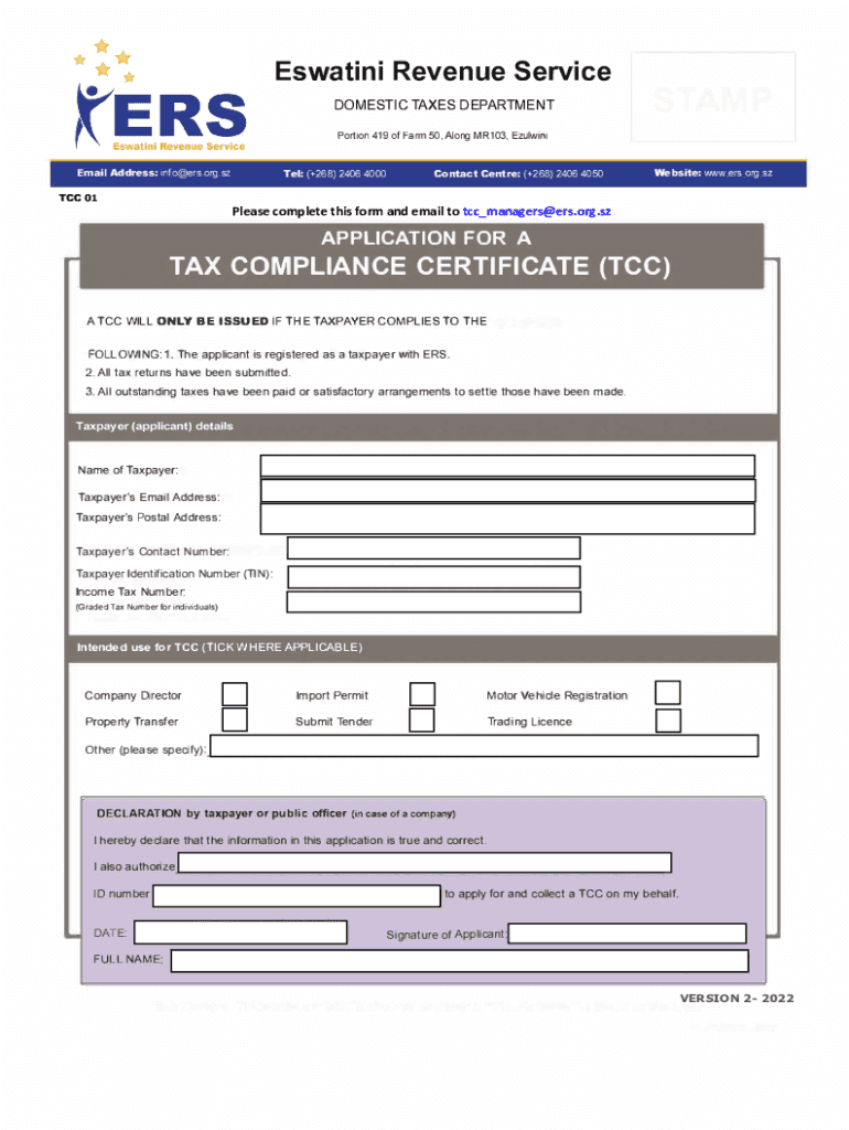 Eswatini Revenue Service DOMESTIC TAXES DEPARTMENT Portion 419 of Farm 50, Along MR103, Exulting Email Address: info@ers.org.sz TCC 01Tel: (+268) 2406 4000Contact Center: (+268) 2406 4050Website: