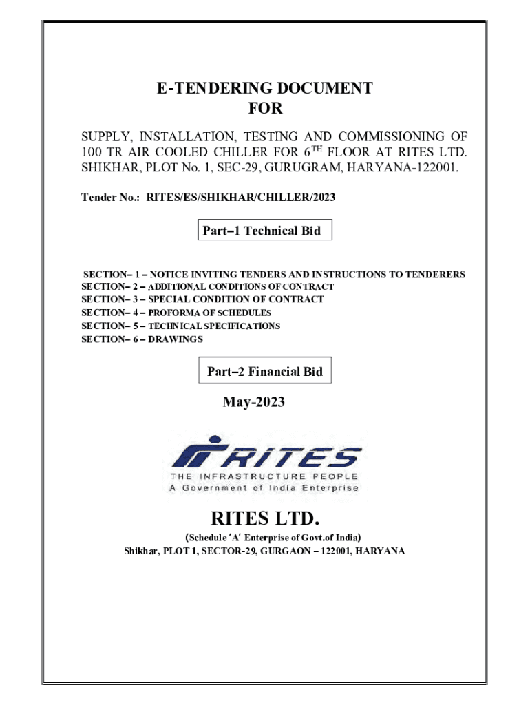 TENDERING DOCUMENT FOR SUPPLY, INSTALLATION, TESTING AND COMMISSIONING OF 100 TR AIR COOLED CHILLER FOR 6TH FLOOR AT RITES LTD. SHIKHAR, PLOT No. 1, SEC29, PROGRAM, HARYANA122001. Tender No.: RITES/ES/SHIKHAR/CHILLER/2023Part1