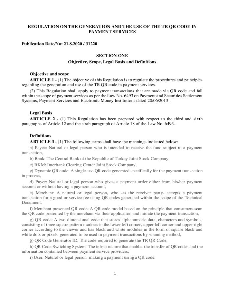 REGULATION ON THE GENERATION AND THE USE OF THE TR QR CODE IN PAYMENT SERVICES Publication Date/No: 21.8.2020 / 31220 SECTION ONE Objective, Scope, Legal Basis and Definitions Objective and scope