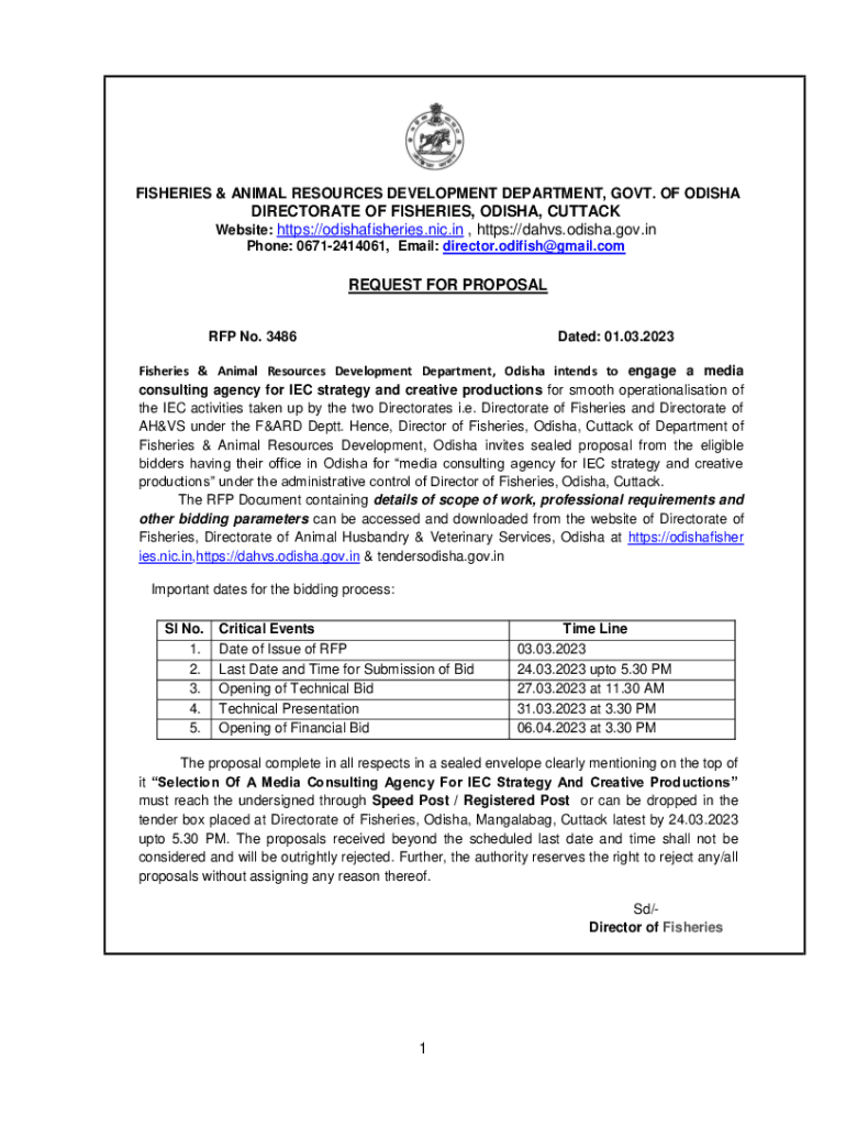 FISHERIES & ANIMAL RESOURCES DEVELOPMENT DEPARTMENT, GOVT. OF ODISHA DIRECTORATE OF FISHERIES, ODISHA, CUTTACK Website: https://odishafisheries.nic.in, https://dahvs.odisha.gov.in Phone: 06712414061,