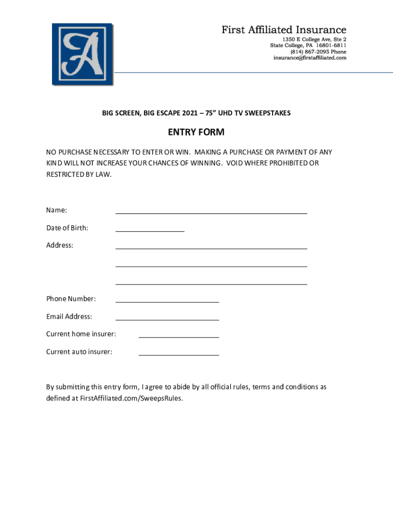 First Affiliated Insurance 1350 E College Ave, Ste 2 State College, PA 168016811 (814) 8672095 Phone insurance@firstaffiliated.comBIG SCREEN, BIG ESCAPE 2021 75 UHD TV SWEEPSTAKESENTRY FORM NO PURCHASE