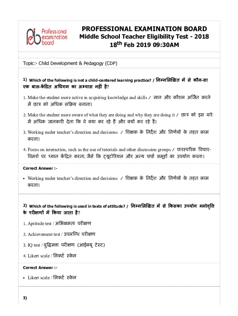 PROFESSIONAL EXAMINATION BOARD Middle School Teacher Eligibility Test 2018 18th Feb 2019 09:30AM Topic: Child Development & Pedagogy (CDP) 1) Which of the following is not a child centered learning
