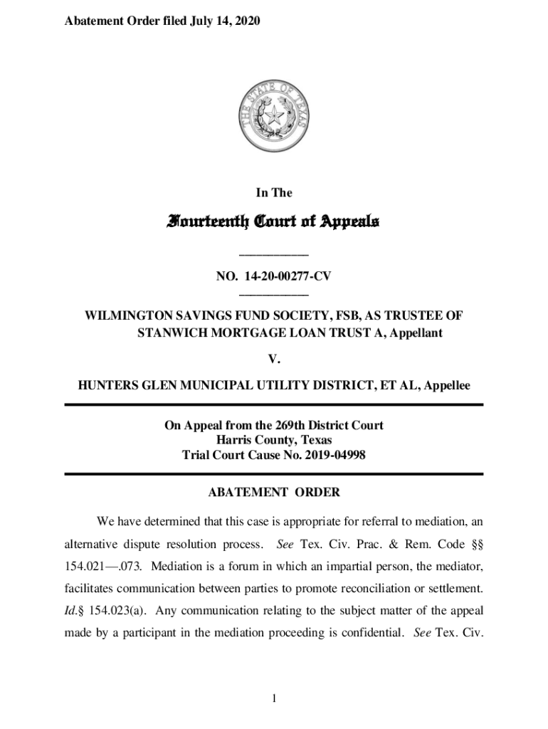 Abatement Order filed July 14, 2020In Fourteenth Court of Appeals ___NO. 142000277CV ___WILMINGTON SAVINGS FUND SOCIETY, FSB, AS TRUSTEE OF SANDWICH MORTGAGE LOAN TRUST A, Appellant V. HUNTERS GLEN