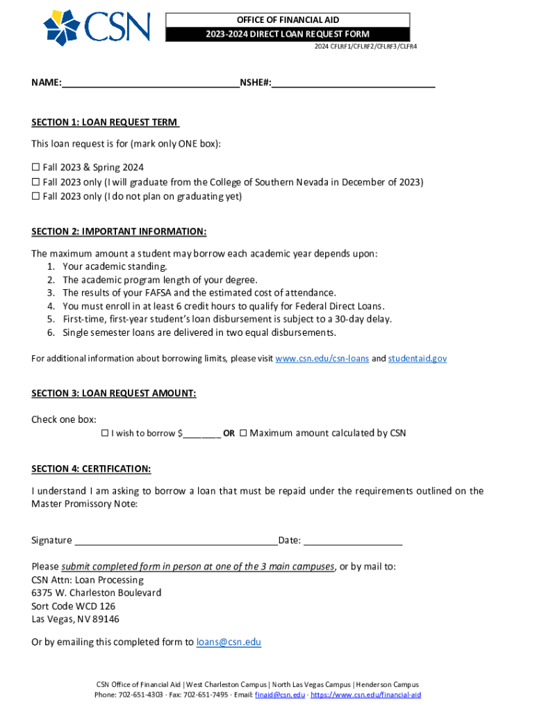 OFFICE OF FINANCIAL AID 20232024 DIRECT LOAN REQUEST FORM 2024 CFLRF1/CFLRF2/CFLRF3/CLFR4NAME: SHE#: SECTION