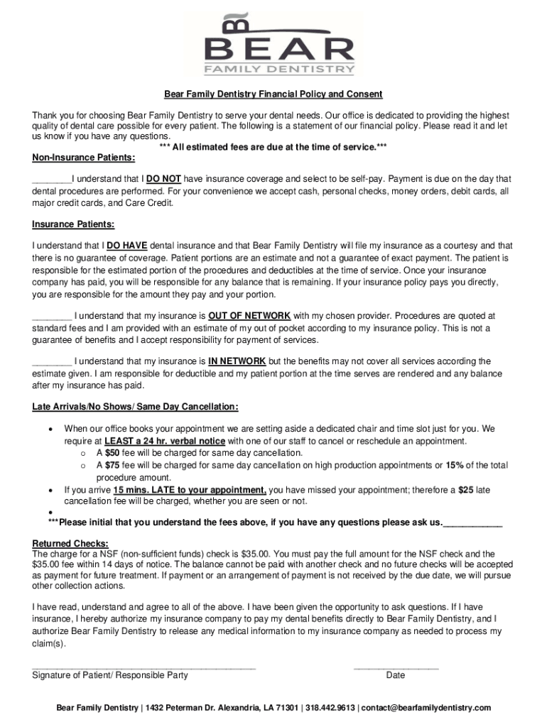 Bear Family Dentistry Financial Policy and Consent Thank you for choosing Bear Family Dentistry to serve your dental needs. Our office is dedicated to providing the highest quality of dental care