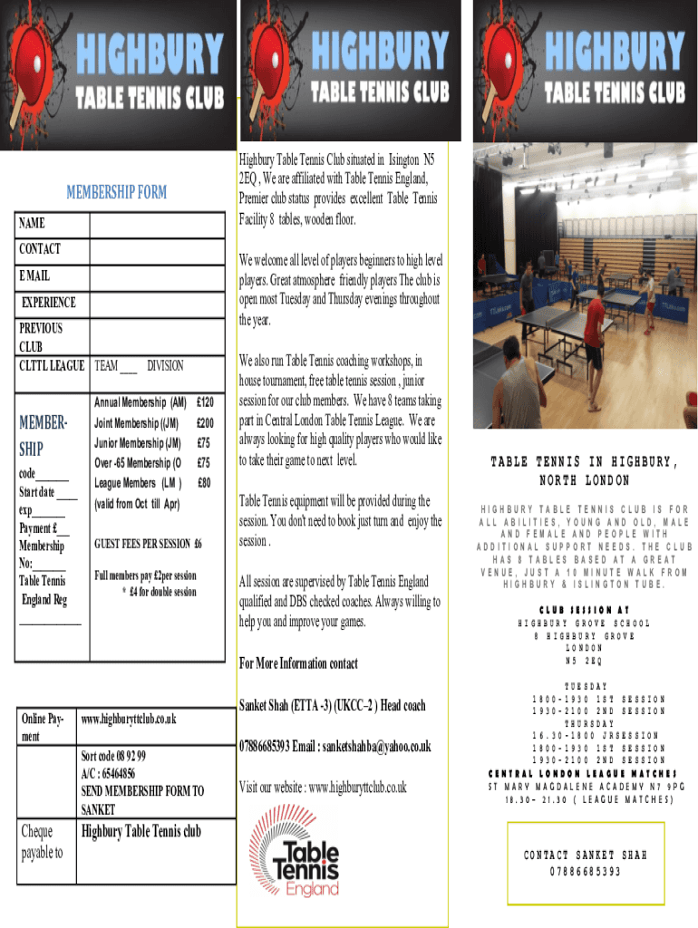 High bury Table Tennis Club situated in Abington N5 2EQ, We are affiliated with Table Tennis England, Premier club status provides excellent Table Tennis Facility 8 tables, wooden floor. MEMBERSHIP