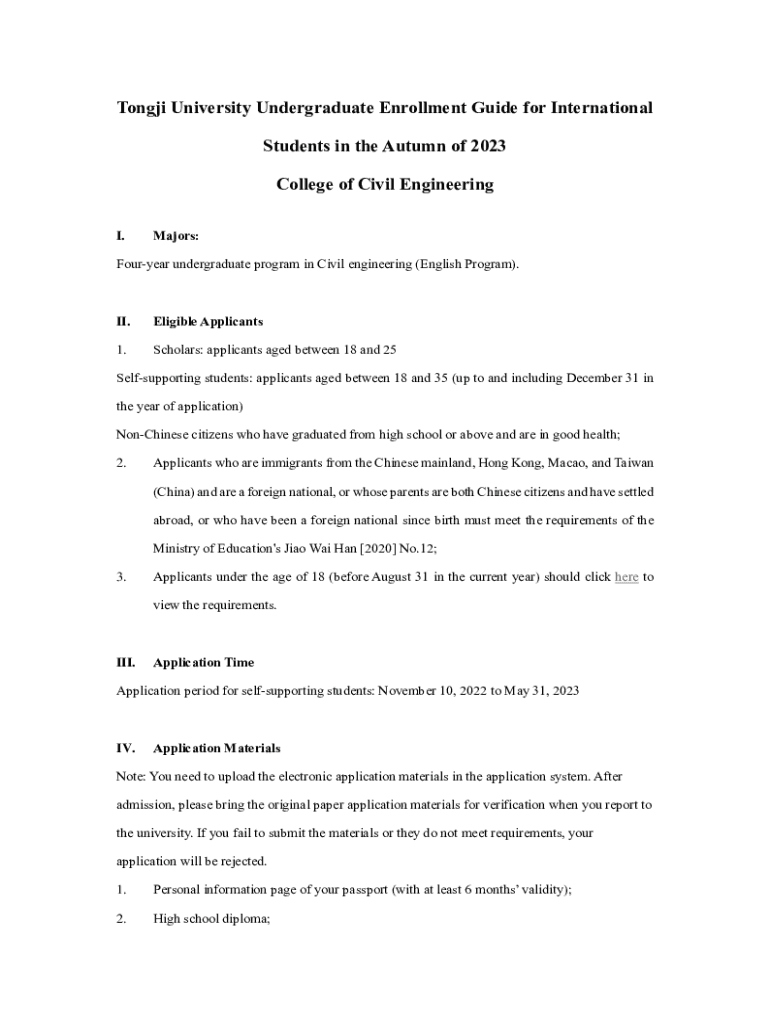 Tongji University Undergraduate Enrollment Guide for International Students in the Autumn of 2023 College of Civil Engineering I. Majors:Fourier undergraduate program in Civil engineering (English