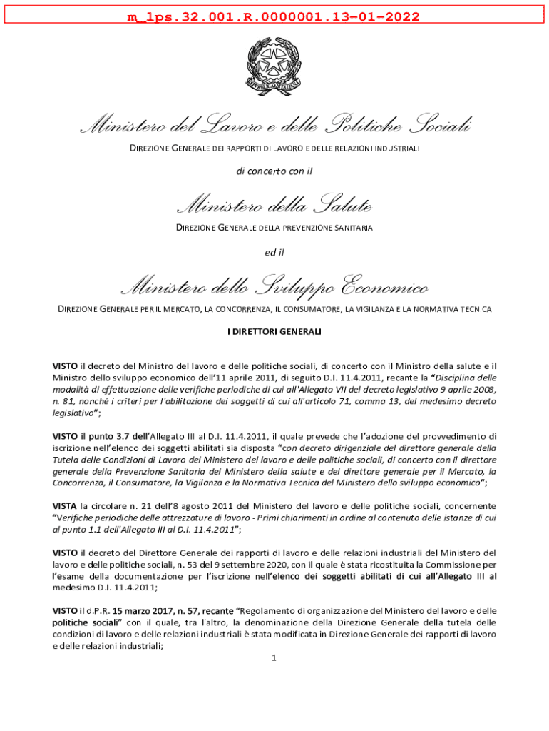 m_lps.32.001.R.0000001.13012022Ministero del Lavoro e delle Politiche Sociali DIREZIONE GENERALE DEI RAPPORTI DI LAVORO E DELLE RELAZIONI INDUSTRIALI di concerto con ilMinistero della Salute DIREZIONE