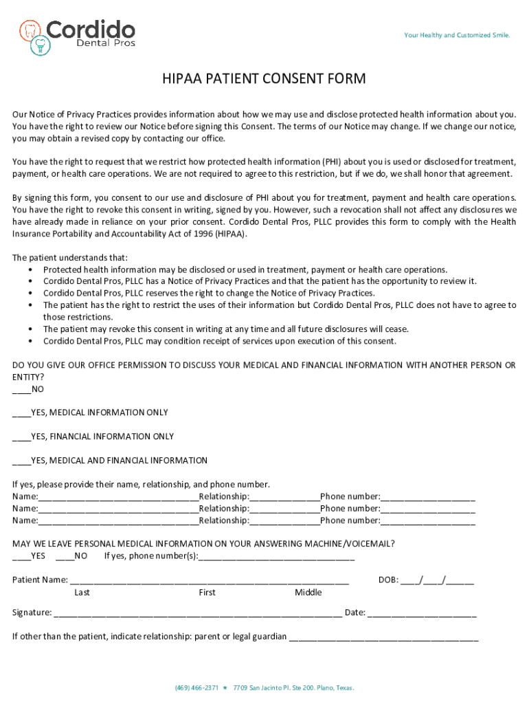 Your Healthy and Customized Smile. HIPAA PATIENT CONSENT From Our Notice of Privacy Practices provides information about how we may use and disclose protected health information about you. You have