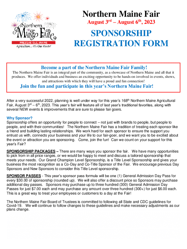 Northern Maine Fair August 3rd August 6th, 2023SPONSORSHIP REGISTRATION FORM Become a part of the Northern Maine Fair Family! The Northern Maine Fair is an integral part of the community, as a showcase