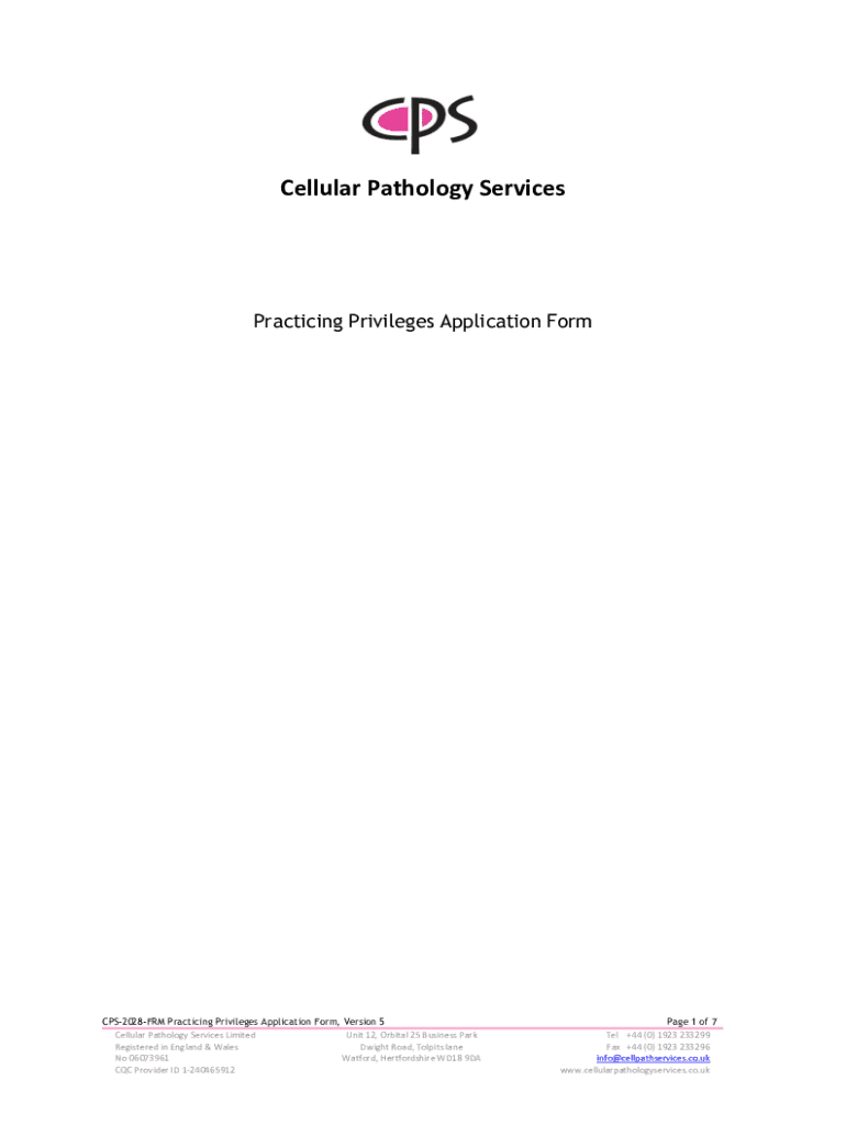 Cellular Pathology ServicesPracticing Privileges Application FormCPS2028FRM Practicing Privileges Application Form, Version 5 Cellular Pathology Services Limited Unit 12, Orbital 25 Business Park