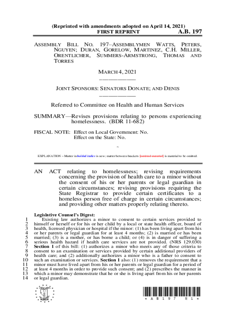 (Reprinted with amendments adopted on April 14, 2021) FIRST REPRINT A.B.197ASSEMBLY BILL NO. 197ASSEMBLYMEN WATTS, PETERS, NGUYEN; DURAN, MORELOS, MARTINEZ, C.H. MILLER, ORENTLICHER, SUMMERSARMSTRONG,