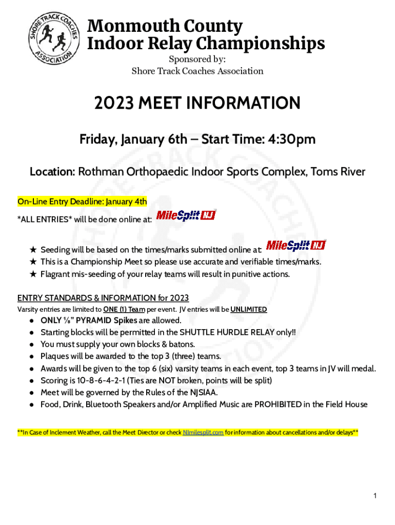 Monmouth County Indoor Relay Championships Sponsored by: Shore Track Coaches Association2023 MEET INFORMATION Friday, January 6th Start Time: 4:30pm Location: Rothman Orthopedic Indoor Sports Complex,