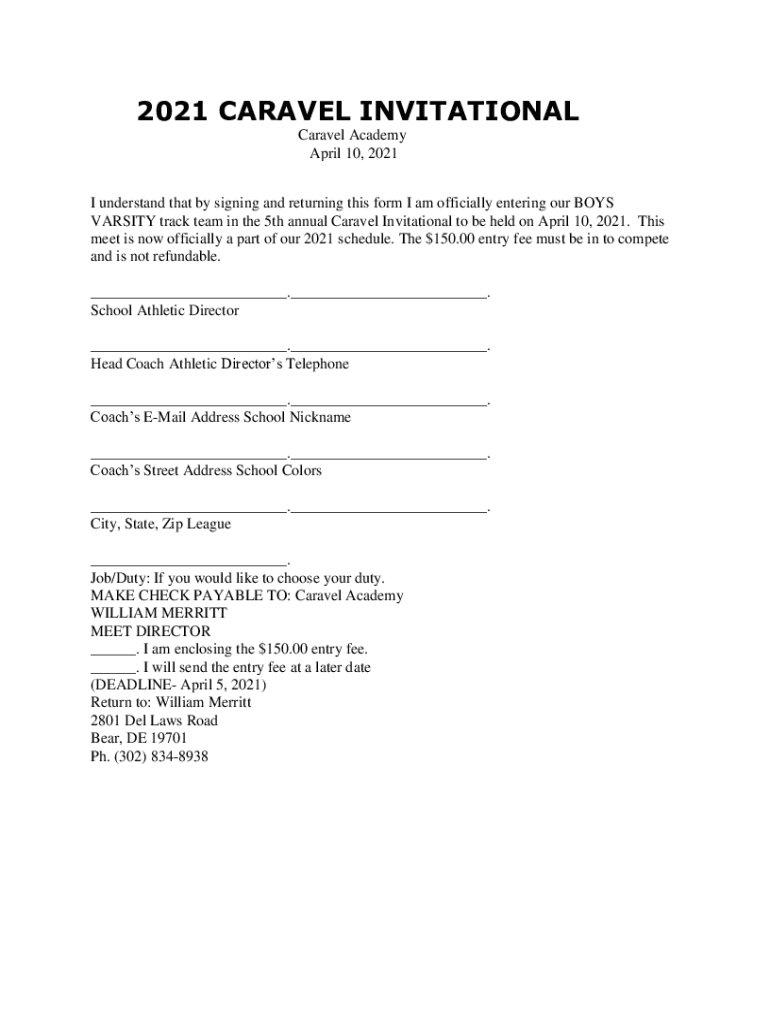 2021 CARAVEL INVITATIONAL Caravel Academy April 10, 2021, I understand that by signing and returning this form I am officially entering our BOYS VARSITY track team in the 5th annual Caravel Invitational