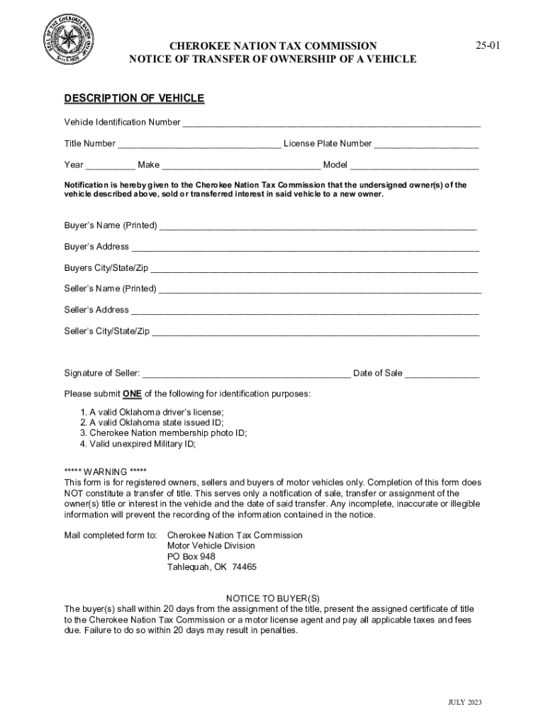 2501CHEROKEE NATION TAX COMMISSION NOTICE OF TRANSFER OF OWNERSHIP OF A VEHICLE DESCRIPTION OF VEHICLEVehicle Identification Number ___ Title Number ___ License Plate Number ___ Year ___ Make ___