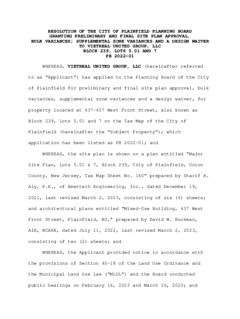 RESOLUTION OF THE CITY OF PLAINFIELD PLANNING BOARD