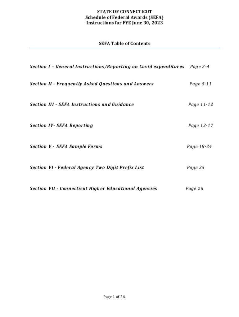 Instructions for FYE June 30, 2023SEFA Table of ContentsSection I General Instructions/Reporting on COVID-19 expenditures Page 24Section II Frequently