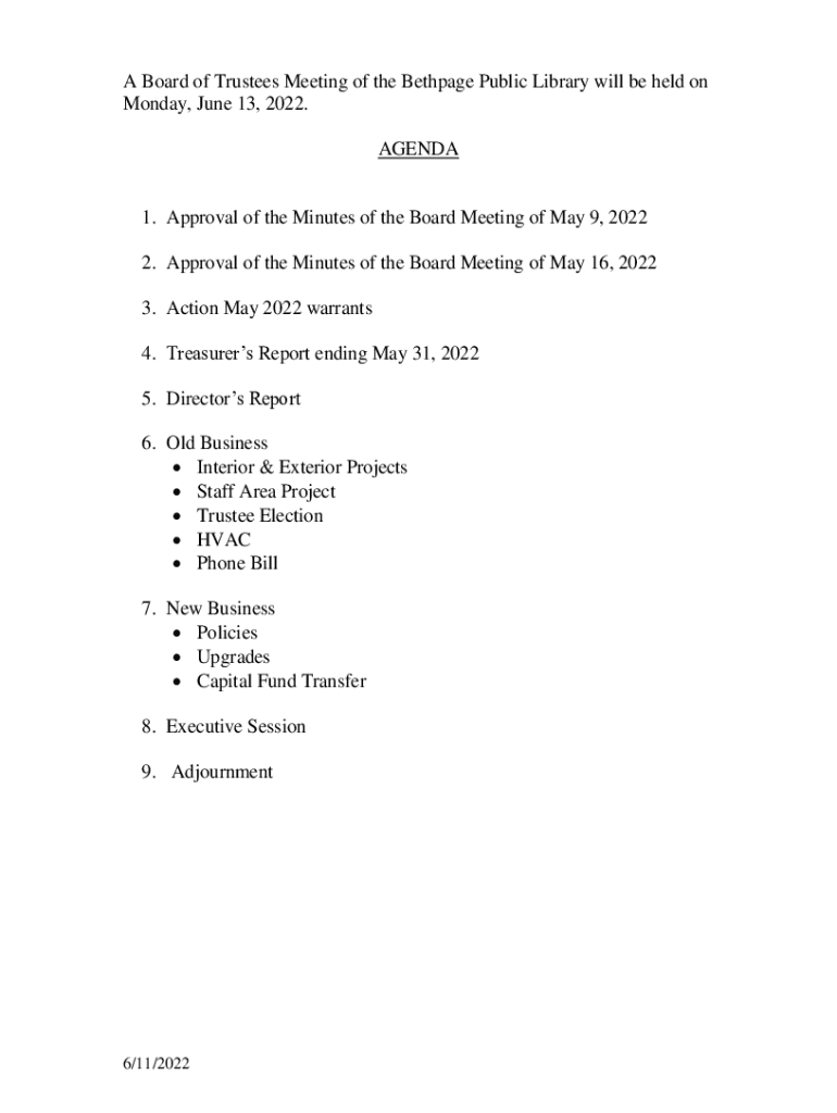 A Board of Trustees Meeting of the Beth page Public Library will be held on Monday, June 13, 2022. AGENDA1. Approval of the Minutes of the Board Meeting of May 9, 2022 2. Approval of the Minutes of
