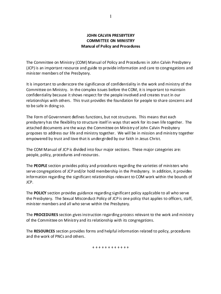 1JOHN CALVIN PRESBYTERYCOMMITTEE ON MINISTRYManual of Policy and Procedures Committee on Ministry (COM) Manual of Policy and Procedures in John Calvin Presbytery(JCP) is an important resource and guide to provide information and care to congregations administer members of the Presbytery.