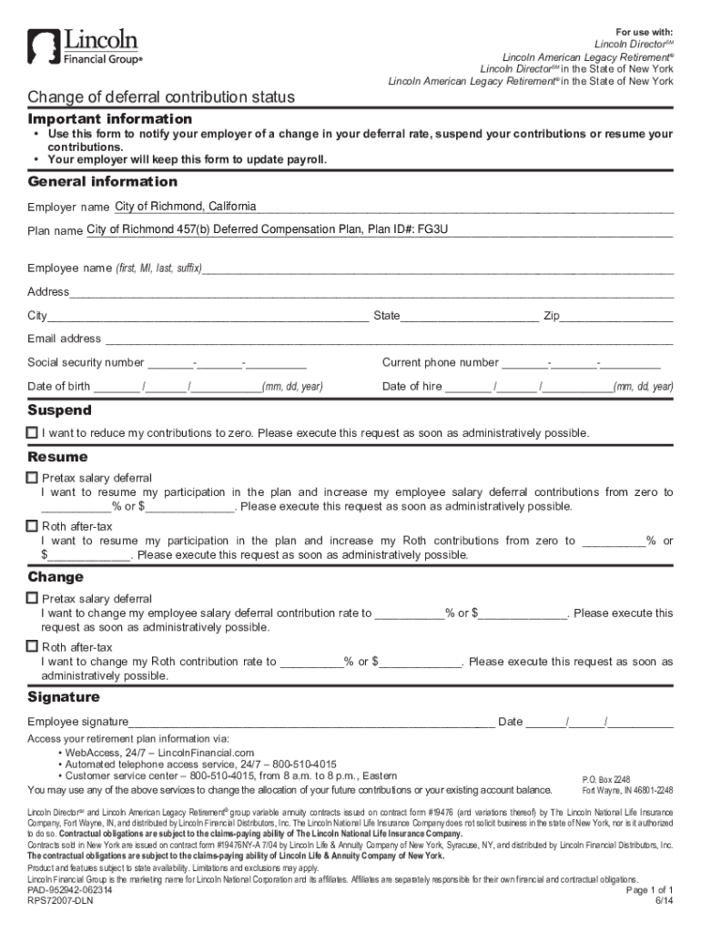 For use with:Change of deferral contribution status Lincoln Directors Lincoln American Legacy Retirement Lincoln Directors in the State of New York Lincoln American Legacy Retirement in the State