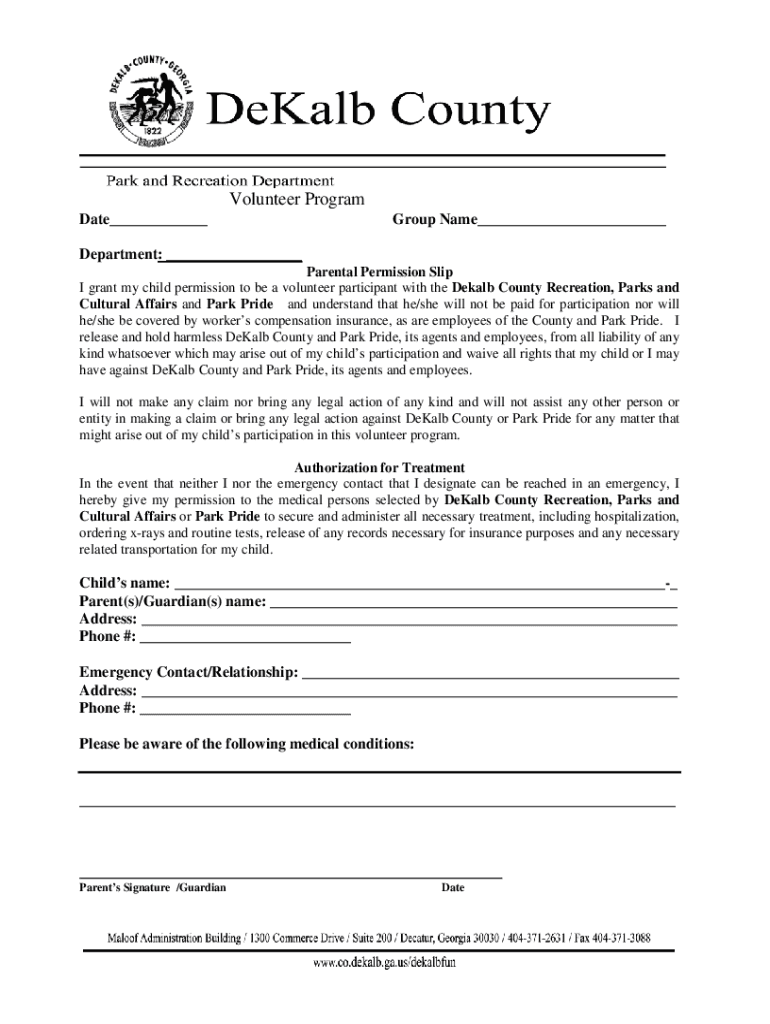 Volunteer Program Date___Group Name___Department: ___ Parental Permission Slip I grant my child permission to be a volunteer participant with the DeKalb County Recreation, Parks and Cultural Affairs