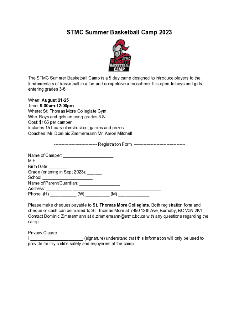 SFMC Summer Basketball Camp 2023The SFMC Summer Basketball Camp is a 5-day camp designed to introduce players to the fundamentals of basketball in a fun and competitive atmosphere. It is open to boys