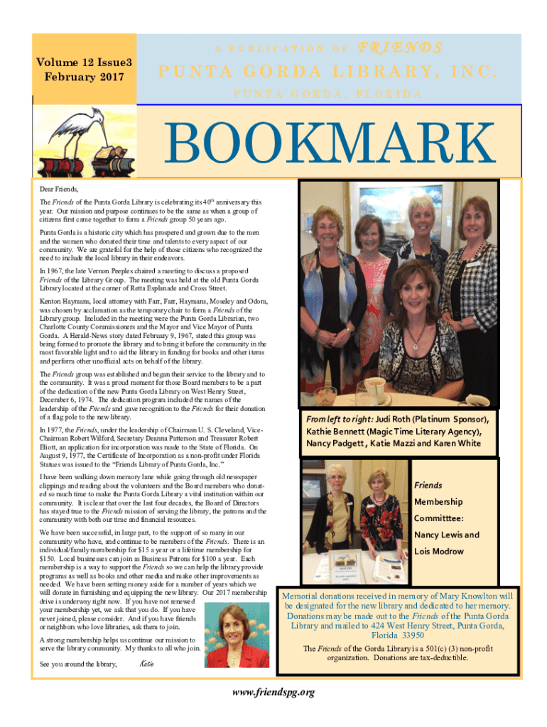 Volume 12 Issue3 February 2017PUBLICA TIONOFFRIENDSPUNTA GOLDA LIBRARY, INC. JUNTA GOLDA, FLORIDABOOKMARK Dear Friends, The Friends of the Junta Golda Library is celebrating its 40th anniversary this