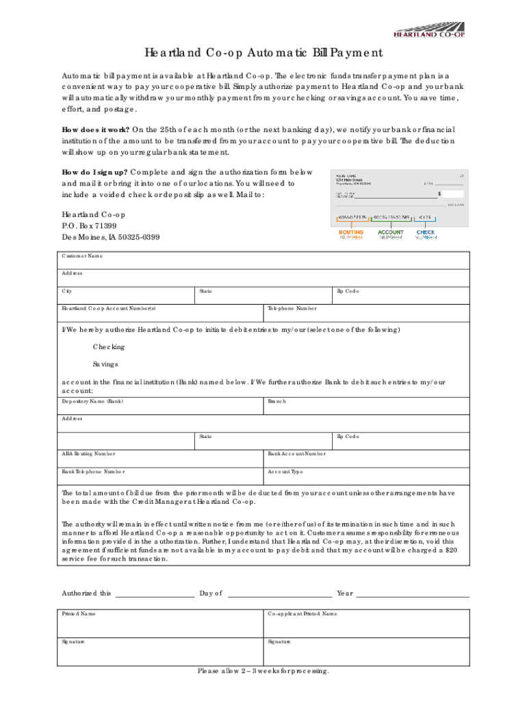 Heartland Coop Automatic Bill Payment Automatic bill payment is available at Heartland Coop. The electronic funds transfer payment plan is a convenient way to pay your cooperative bill. Simply authorize