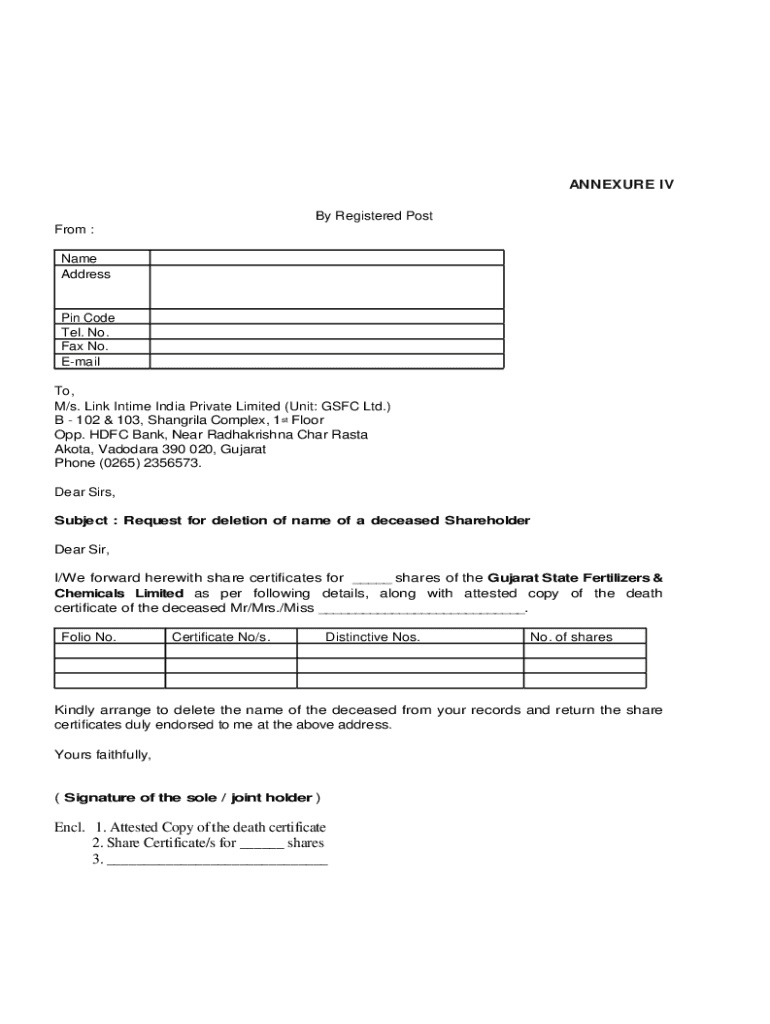 Appendix IV By Registered Post From : Name Addressing Code Tel. No. Fax No. Email To, M/s. Link In time India Private Limited (Unit: SFC Ltd.) B 102 & 103, Shangri-La Complex, 1st Floor Opp. HDFC