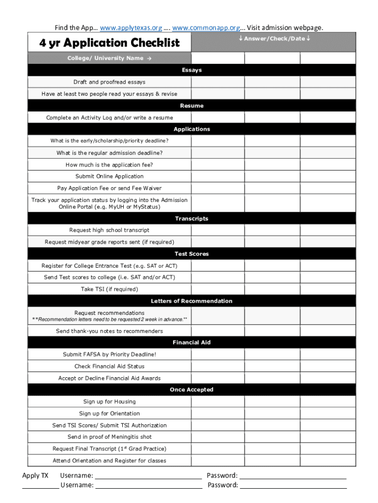 Find the App www.applytexas.org. www.commonapp.org... Visit admission webpage. Answer/Check/Date 4 yr Application Checklist College/ University Name Essays Draft and proofread essays Have at least