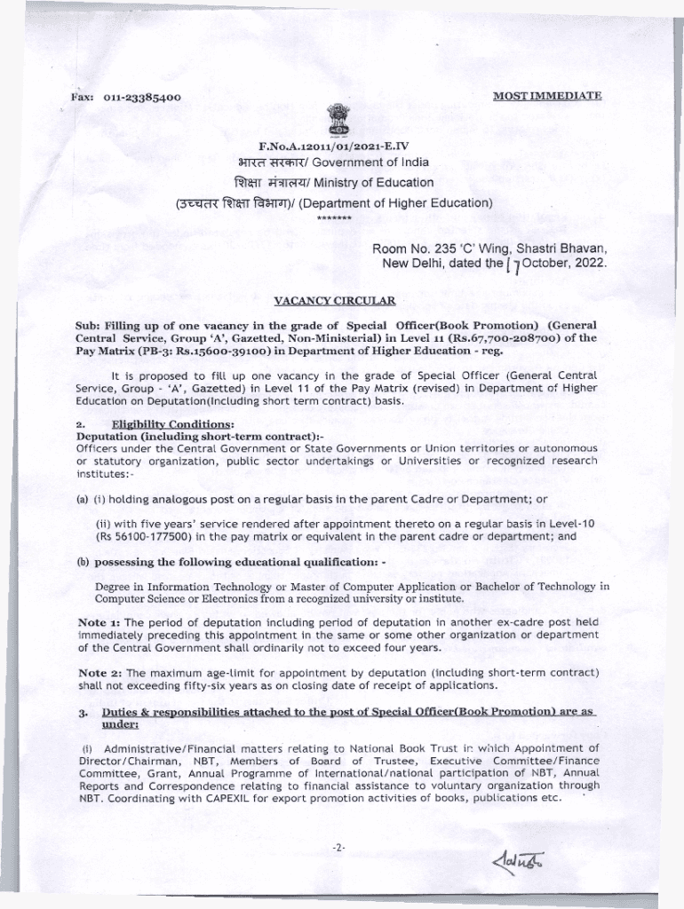 Fax:01123385400MOST IMMEDIATE. N0. A.12011/01/2021E.IVWcTTR^R/ Government of IndiafsTSdT stater/ Ministry of Educationist)/ (Department of Higher Education)Room No. 235 C Wing, Shasta Haven,