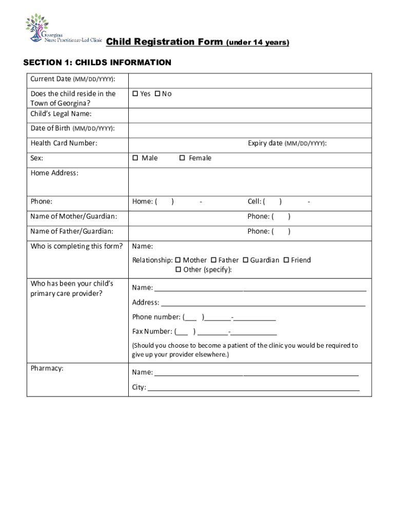 Child Registration Form(under 14 years)SECTION 1: CHILD INFORMATION Current Date (MM/DD/YYY): Does the child reside in the Town of Georgina? Child's Legal Name: Yes Notate of Birth (MM/DD/YYY): Health
