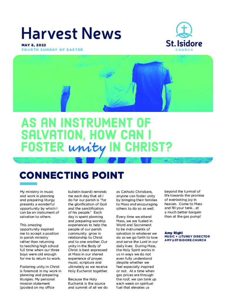 Harvest News MAY 8, 2 02 2 F O U R T H S U N D A O F E A S T ER CONNECTING POINT My ministry in music and work in planning and preparing liturgy presents a wonderful opportunity by which I can be