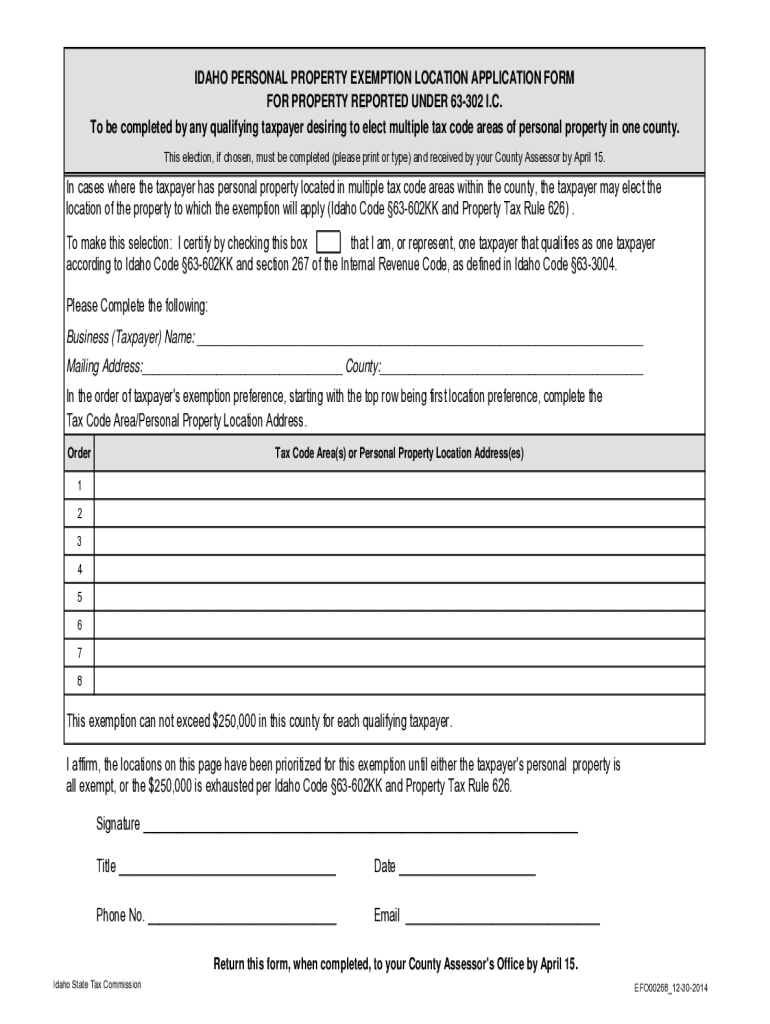 IDAHO PERSONAL PROPERTY EXEMPTION LOCATION APPLICATION FORM FOR PROPERTY REPORTED UNDER 63302 I.C. To be completed by any qualifying taxpayer desiring to elect multiple tax code areas of personal