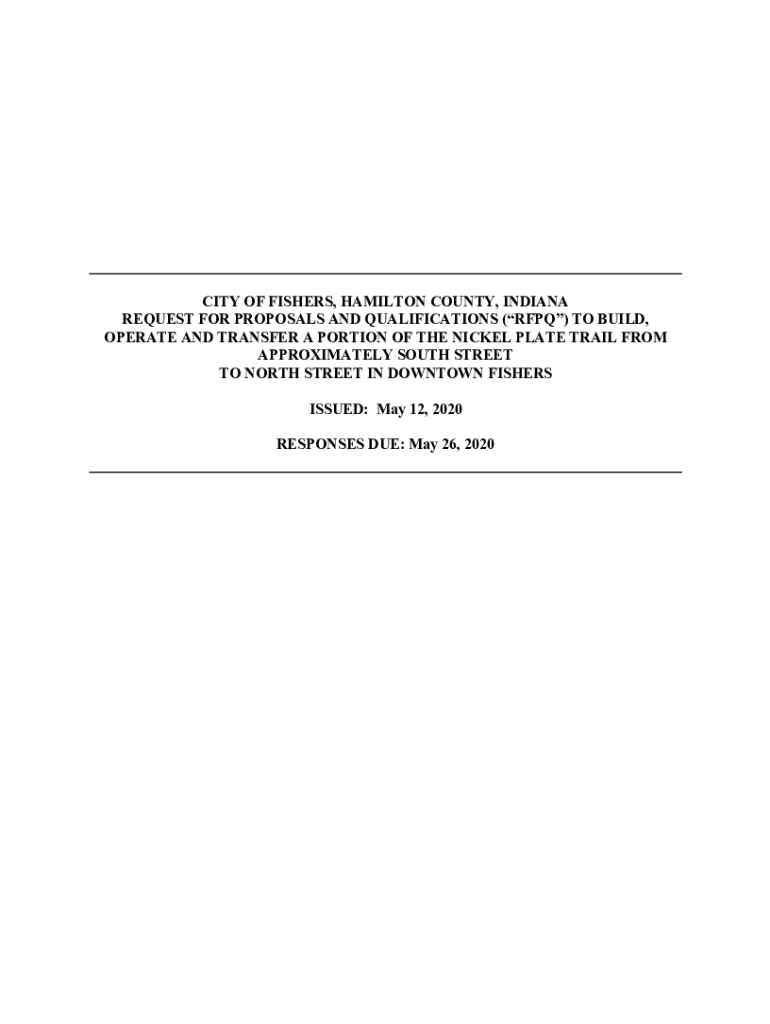 CITY OF FISHERS, HAMILTON COUNTY, INDIANA REQUEST FOR PROPOSALS AND QUALIFICATIONS (RFP) TO BUILD, OPERATE AND TRANSFER A PORTION OF THE NICKEL PLATE TRAIL FROM APPROXIMATELY SOUTH STREET TO NORTH