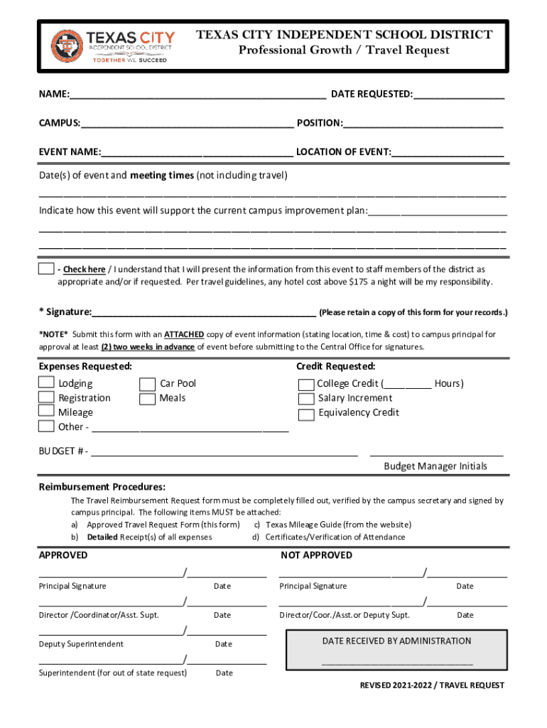 TEXAS CITY INDEPENDENT SCHOOL DISTRICT Professional Growth / Travel Request NAME:___ DATE REQUESTED:___ CAMPUS:___ POSITION:___ EVENT NAME:___ LOCATION OF EVENT:___ Date(s) of event and meeting times