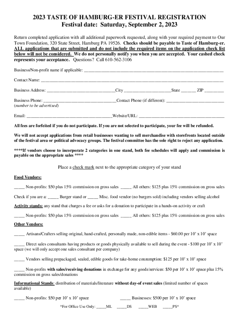 2023 TASTE OF HAMBURGER FESTIVAL REGISTRATION Festival date: Saturday, September 2, 2023, Return completed application with all additional paperwork requested, along with your required payment to