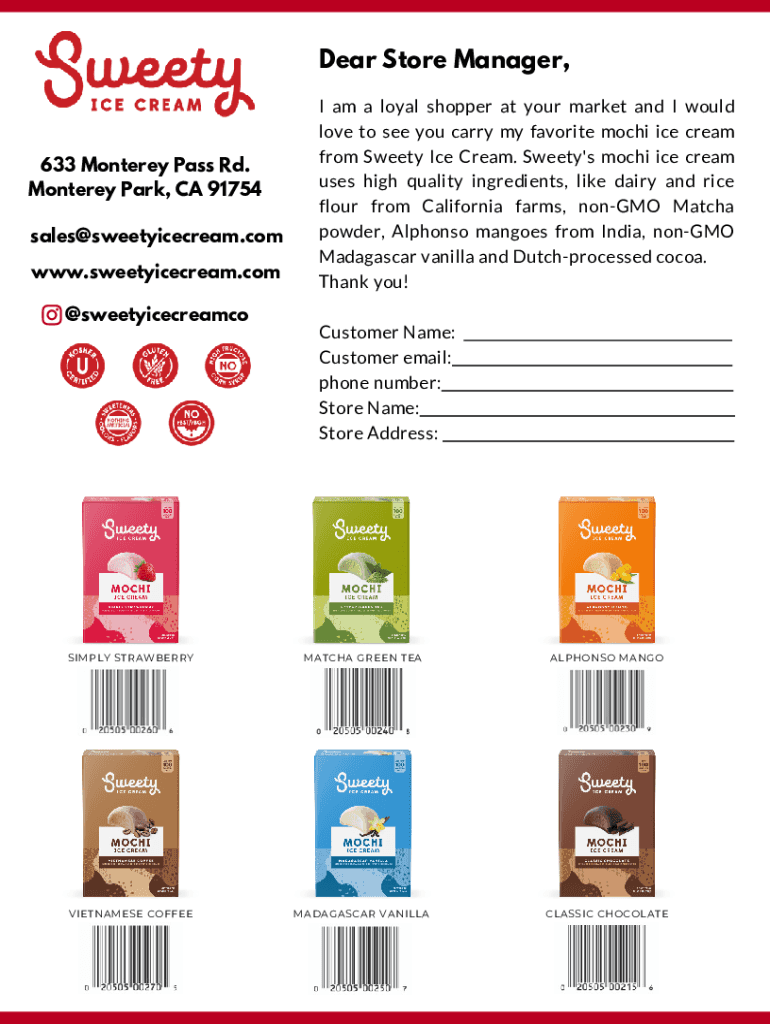 Dear Store Manager,633 Monterey Pass Rd. Monterey Park, CA 91754 sales@sweetyicecream.comwww.sweetyicecream.com @sweetyicecreamcoI am a loyal shopper at your market and I would love to see you carry