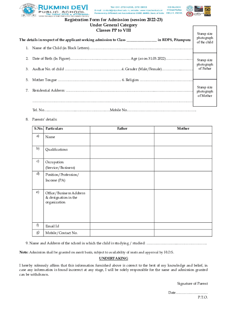 Registration Form for Admission (session 202223) Under General Category Classes PP to VIII The details in respect of the applicant seeking admission to Class ___ in RDS, PitampuraStamp size photograph