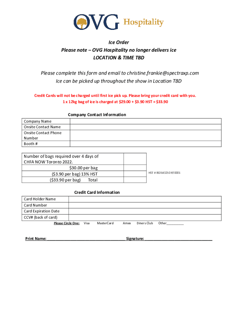 Ice Order Please note AVG Hospitality no longer delivers ice LOCATION & TIME TBD Please complete this form and email to christine.frankie@spectraxp.com Ice can be picked up throughout the show in