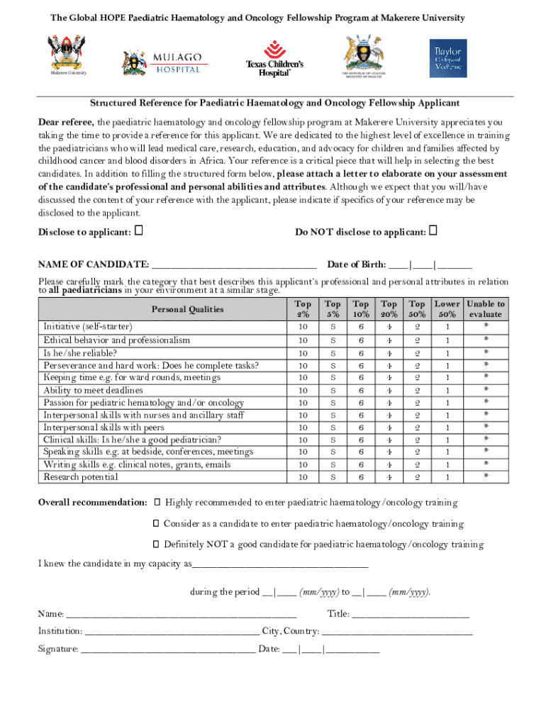 The Global HOPE Pediatric Hematology and Oncology Fellowship Program at Maker ere UniversityMakerere UniversityStructured Reference for Pediatric Hematology and Oncology Fellowship Applicant