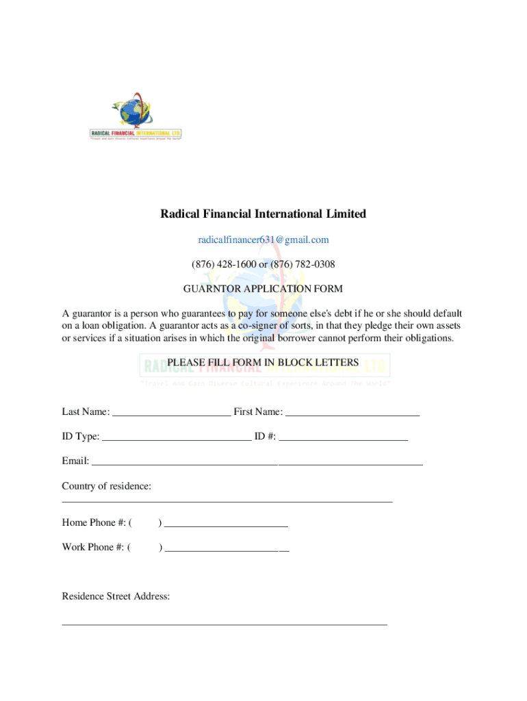 Radical Financial International Limited radicalfinancer631@gmail.com (876) 4281600 or (876) 7820308 GUARANTOR APPLICATION From A guarantor is a person who guarantees to pay for someone else\'s debt