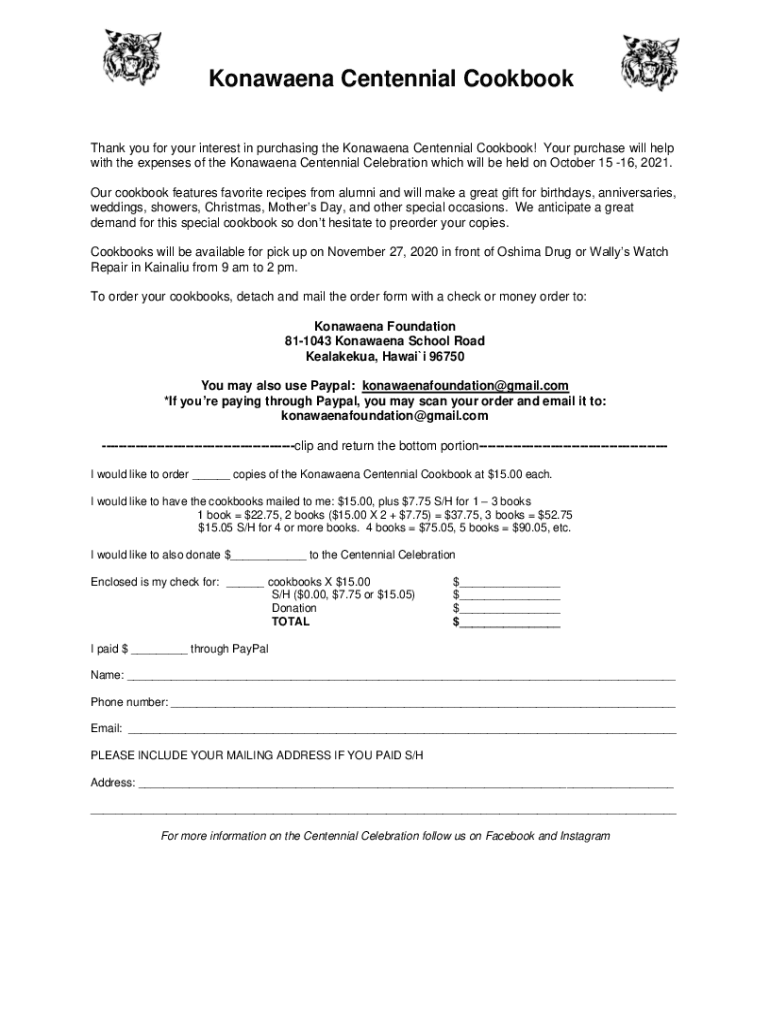 Thank you for your interest in purchasing the Konawaena Centennial Cookbook! Your purchase will help