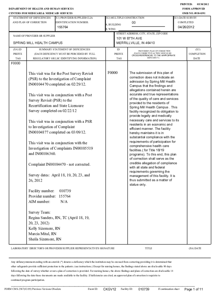 PRINTED: DEPARTMENT OF HEALTH AND HUMAN SERVICES CENTERS FOR MEDICARE & MEDICAID SERVICES STATEMENT OF DEFICIENCIES(X1) PROVIDER/SUPPLIER/LIGAND PLAN OF CORRECTIONIDENTIFICATION NUMBER:15576405/30/2012FORM