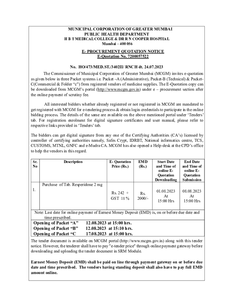 MUNICIPAL CORPORATION OF GREATER MUMBAI PUBLIC HEALTH DEPARTMENT H B T MEDICAL COLLEGE & DR R N COOPER HOSPITAL Mumbai 400 056E PROCUREMENT QUOTATION NOTICE Quotation No. 7200057522 No. HO/473/MED.ST./3402II/