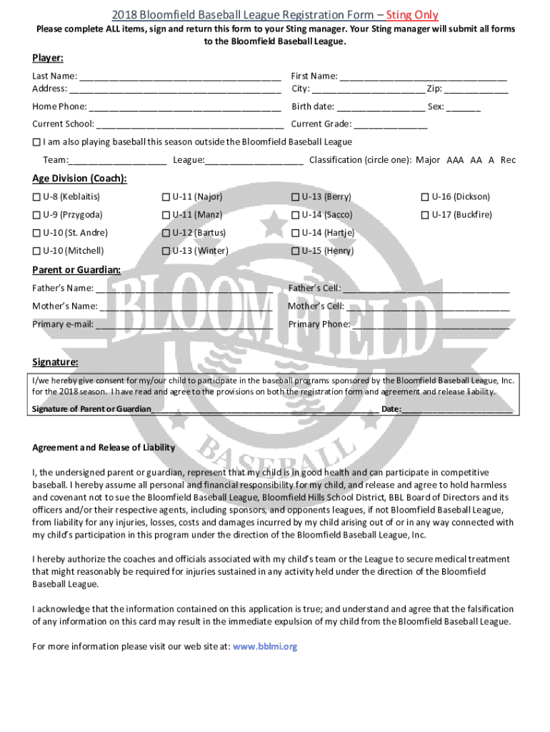 2018 Bloomfield Baseball League Registration Form Sting Only Please complete ALL items, sign and return this form to your Sting manager. Your Sting manager will submit all forms to the Bloomfield