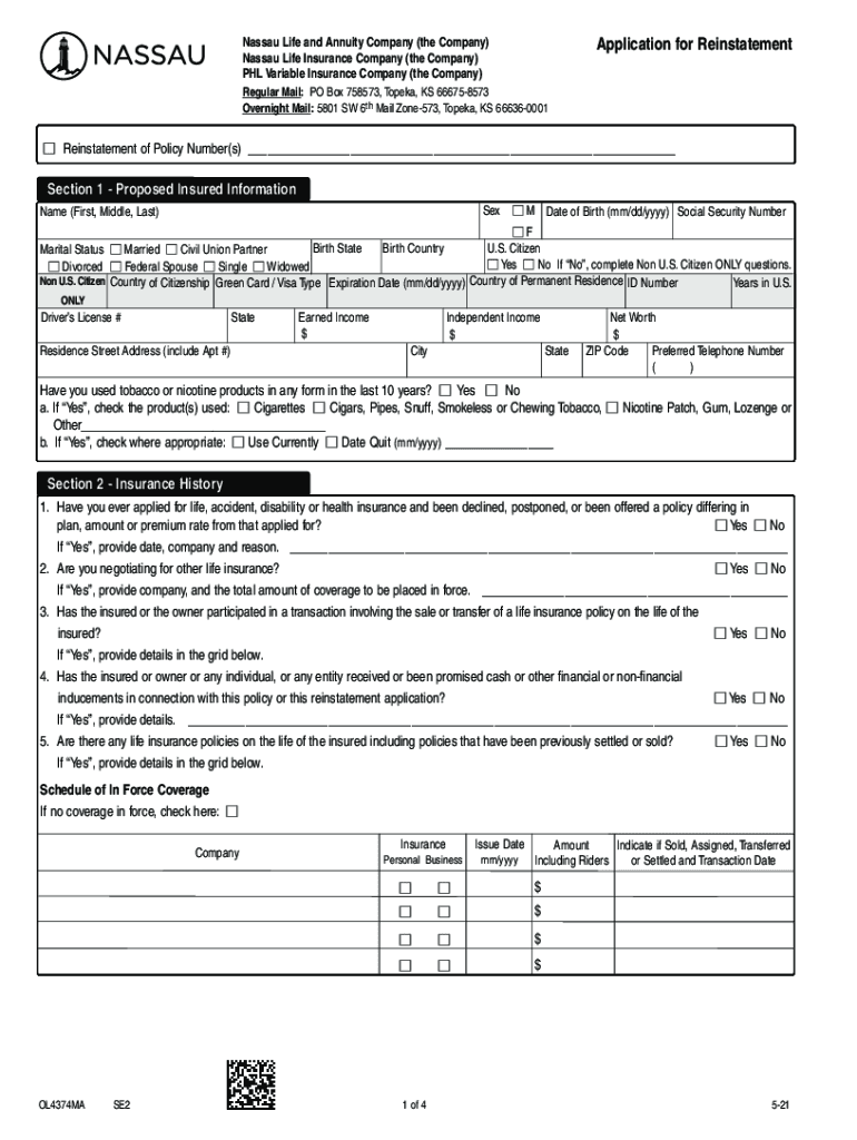 Nassau Life and Annuity Company (the Company) Nassau Life Insurance Company (the Company) PHL Variable Insurance Company (the Company)Reinstatement/Extension Quick Reference your policy has lapsed,