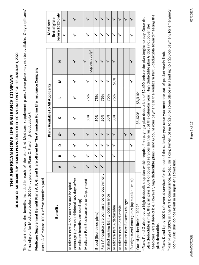 THE AMERICAN HOME LIFE INSURANCE COMPANY$26,62050%50%50%50%50%K$23,31075%75%75%75%75%L50%M copay apply3 NCF1Medicare first eligible before 2020 onlyAMHMS07201IL1Page 1 of 1707/2022APlans F and G also