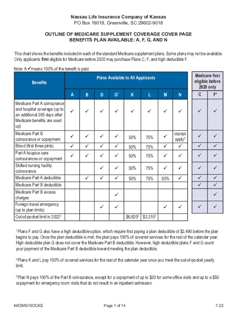 Nassau Life Insurance Company of Kansas PO Box 19018, Greenville, SC 296029018 OUTLINE OF MEDICARE SUPPLEMENT COVERAGE COVER PAGE BENEFITS PLAN AVAILABLE: A, F, G, AND N This chart shows the benefits